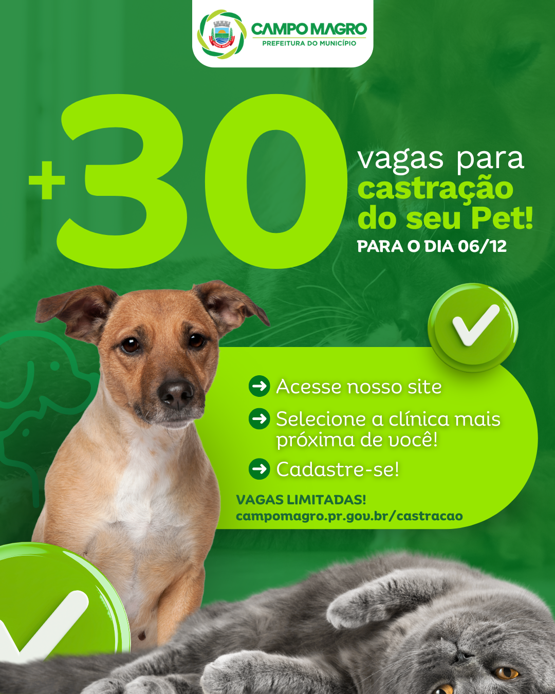 A Prefeitura de Campo Magro, por meio da Secretaria da Saúde, anuncia a abertura de mais de 30 novas vagas para o programa de castração gratuita de cães e gatos, reforçando o compromisso com o bem-estar animal e a saúde pública. Os atendimentos desta etapa acontecerão no dia 06 de dezembro, mediante cadastro prévio.