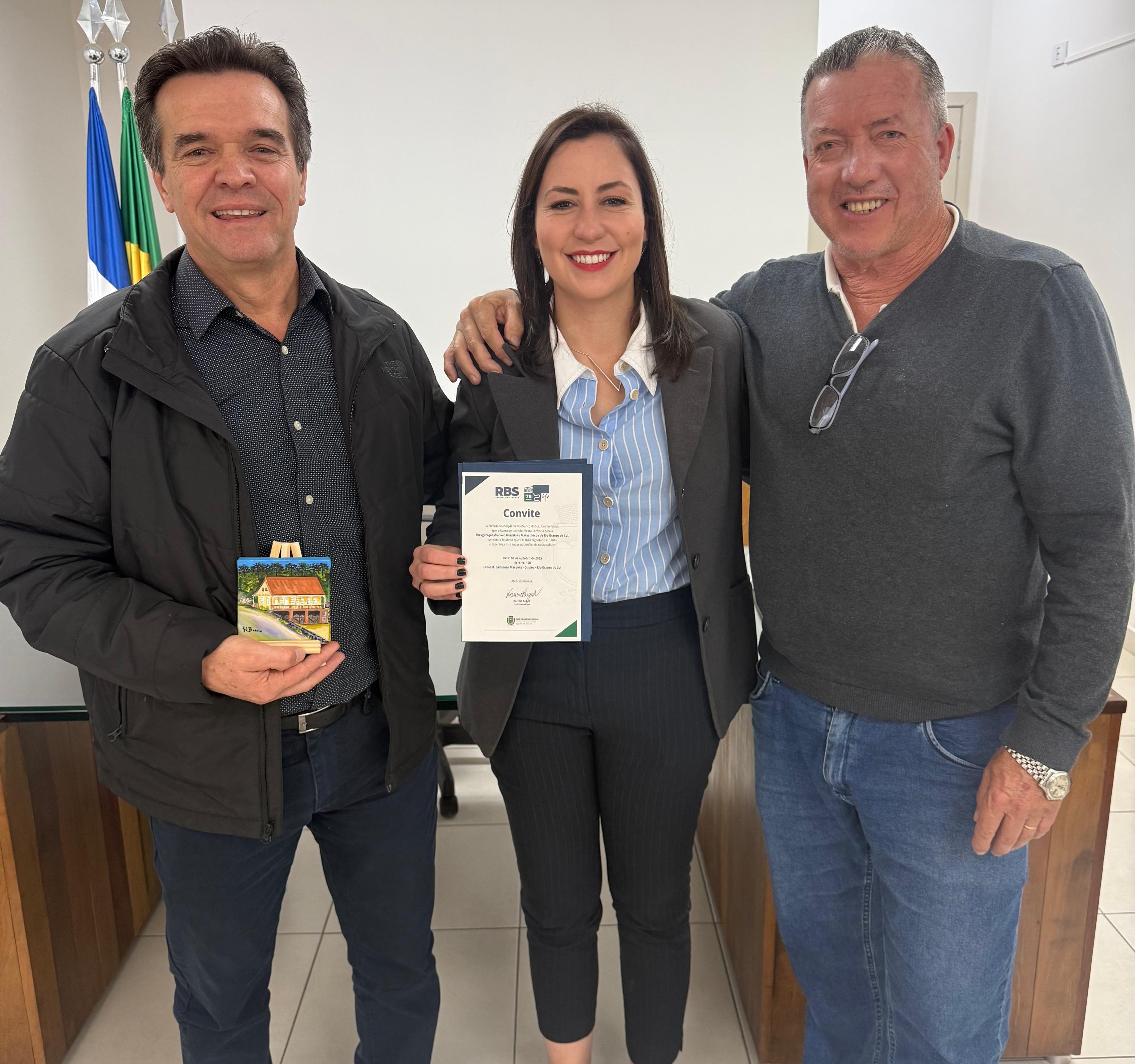 O prefeito Bozinha e o vice-prefeito Gusto Juninho receberam nesta quinta-feira, 02 de outubro, a prefeita de Rio Branco do Sul Karime Fayad. O encontro teve por objetivo estreitar laços entre os gestores – além do convite a inauguração do novo Hospital e Maternidade de Rio Branco do Sul.