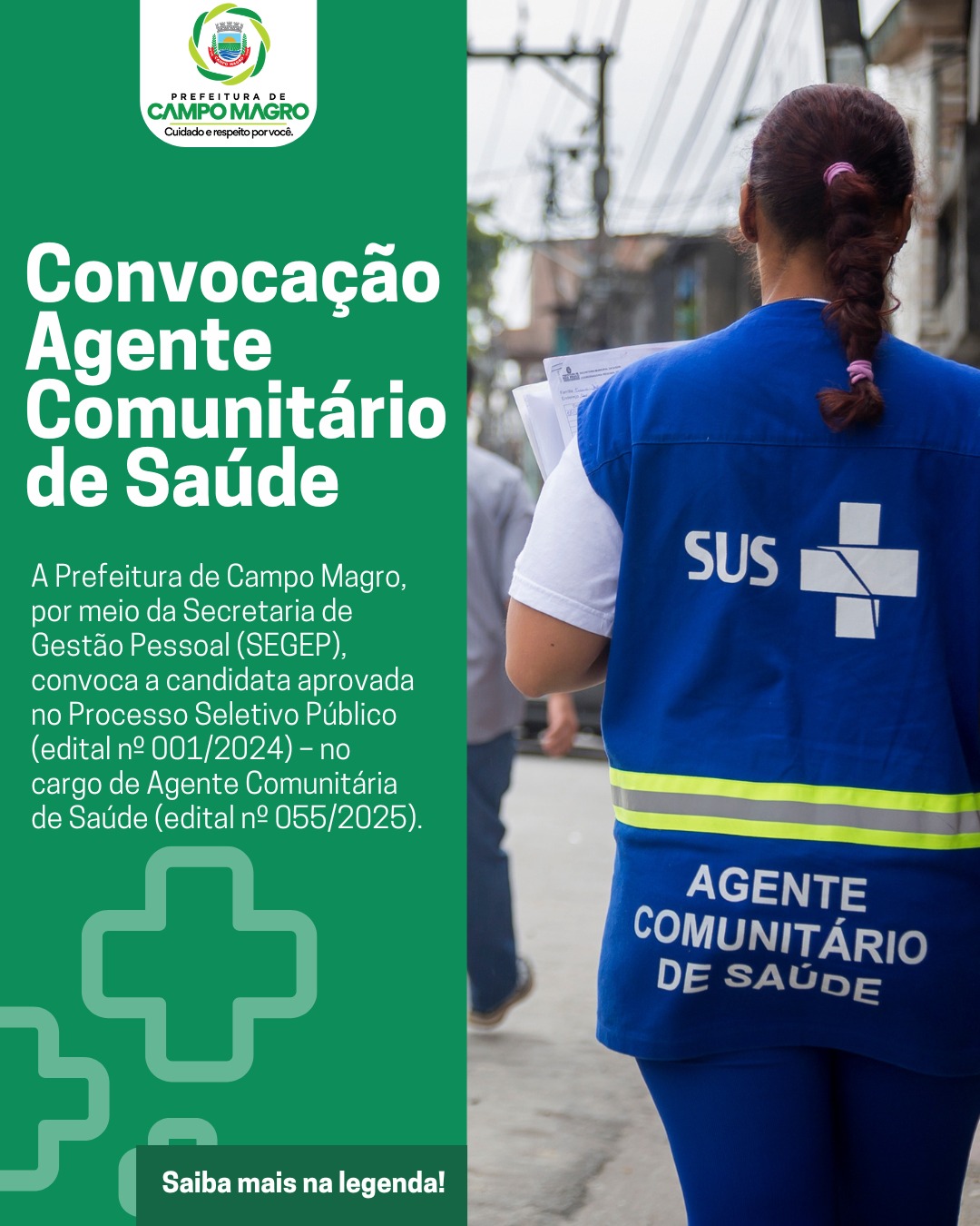A Prefeitura de Campo Magro, por meio da Secretaria de Gestão Pessoal (SEGEP), convoca a candidata aprovada no Processo Seletivo Público (edital nº 001/2024) – no cargo de Agente Comunitária de Saúde (edital n&o...